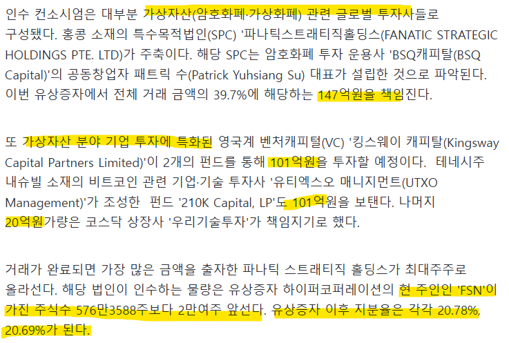 코스닥 상장사 '하이퍼코퍼레이션'이 경영권 변동을 수반하는 대규모 자금조달을 예고했다. 홍콩계 투자사를 필두로 한 인수 컨소시엄이 유상증자에 참여해 발행주식 총수를 넘는 대량의 신주