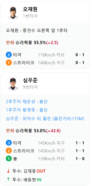 그리고 3번째 공에서 심우준에게 쓰리런을 맞았다.. 작년에 심우준 못한다고 그렇게 사람들이 뭐라 했는데 그 홈런 하나로 국민거포 유격수가 되어 버렸다. 내참.